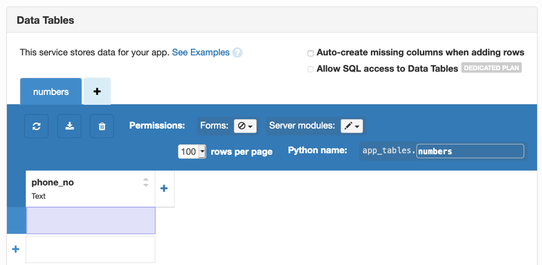 We want to store our registered users’ numbers in a database so we can send them an SMS every day. We’ll use Anvil’s Data Tables to do this, and the setup looks like this: