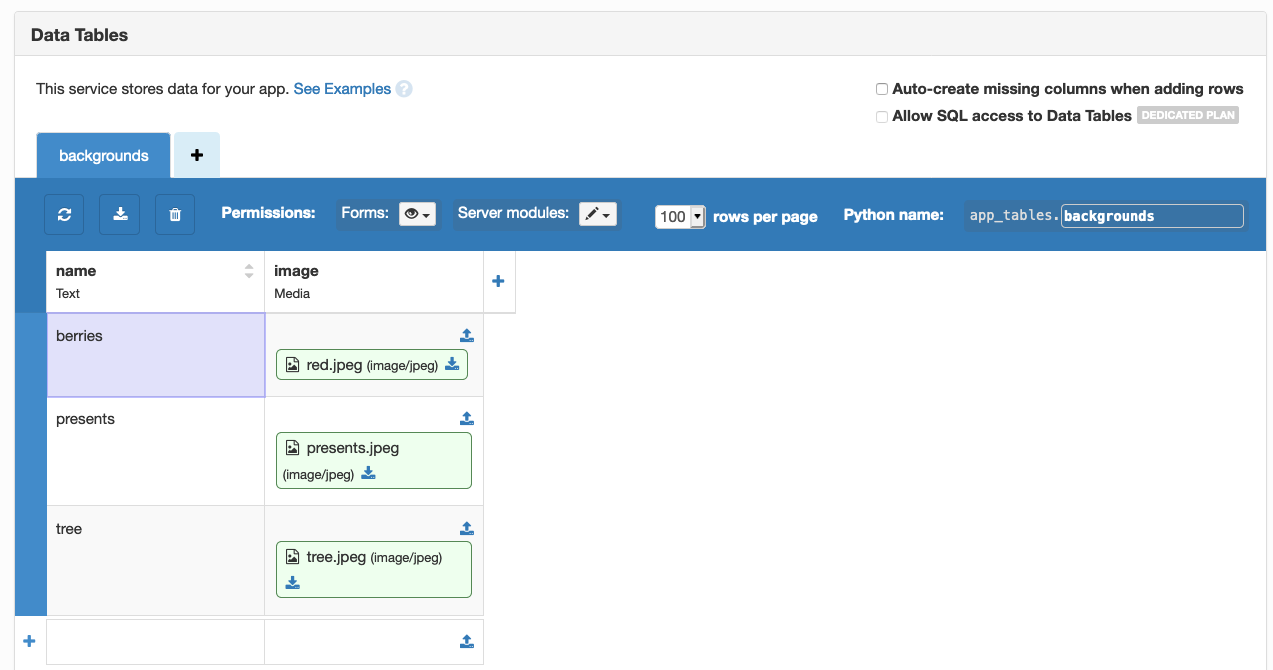 We’ll use Anvil’s Data Tables to store background images for our users to choose from when creating their card.