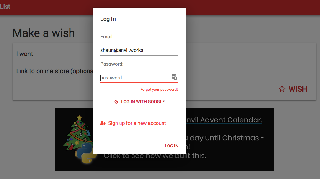 You’ve got to be logged in to make a list, so the first time the “wish” button is pressed, I display a login form using: