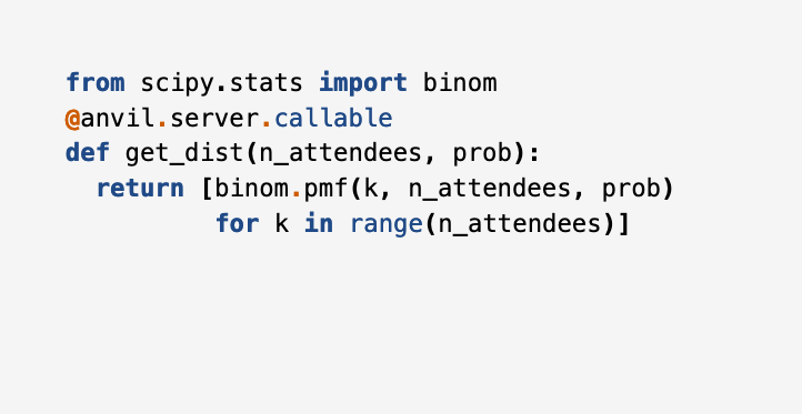 When you hit Enter in this text box, we’re going to call that get_dist() function we defined earlier. The number of attendees is 3,200, and we can estimate the probability from the number we gave out last time, because that was also out of a population of 3,200
