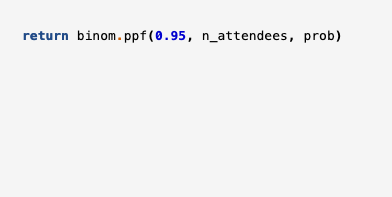 What we want to do is to find a number of shirts such that there is a 95% probability of needing that number or less. This is the 95% point of the probability distribution, and SciPy provides a function for calculating this: binom.ppf().