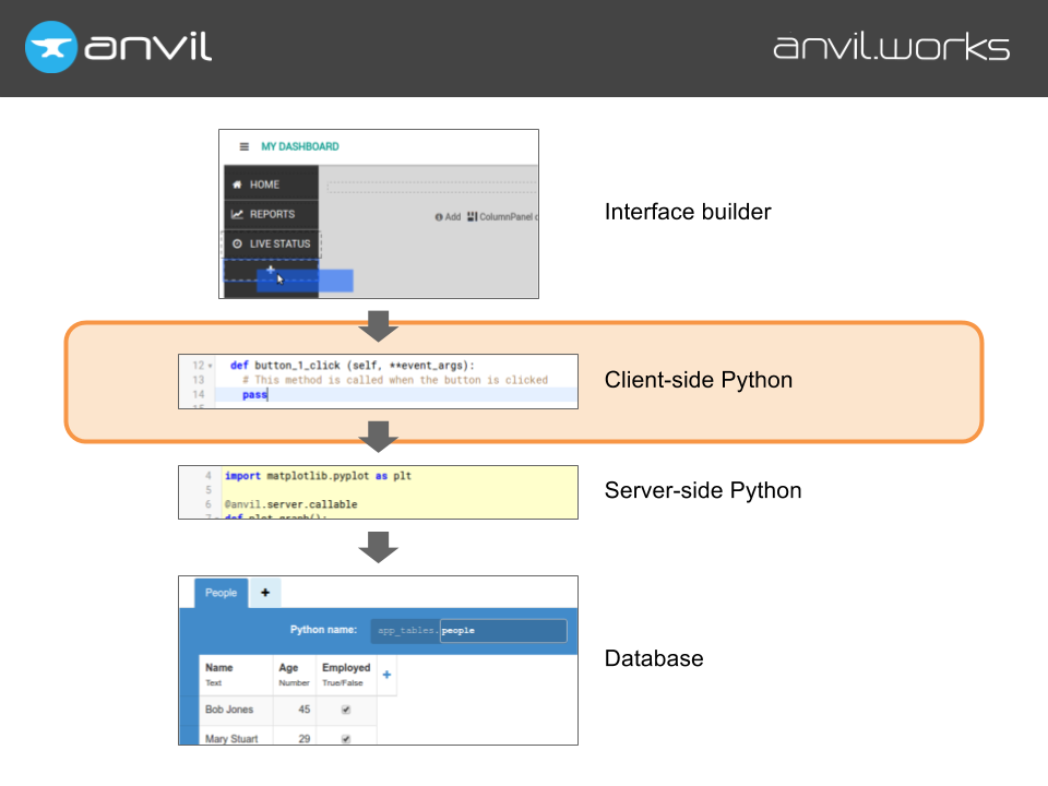 We built a graphical interface builder for designing your pages, and let you write your client-side code in Python - so all the buttons, text fields etc you put on your page are just Python objects. We built a back-end server environment, also in Python, and a database with a pure Python API, all deployed in the cloud in one click.