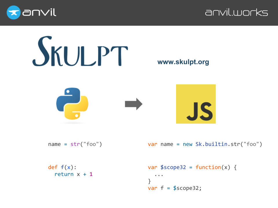 Thankfully, there’s a great open-source project called Skulpt, that compiles Python to Javascript. So you can write Python to drive your app, and we can compile it to Javascript so that when you publish it online, your code actually runs in a user’s browser. We give Skulpt Python objects, it represents them as Javascript objects. We give it a Python function, and it produces a Javascript function for the browser to run.