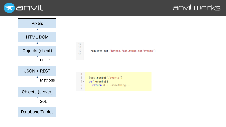 So that’s what we do. Have a function on the server, decorate it with @anvil.server.callable, and call it from the client with a function call.