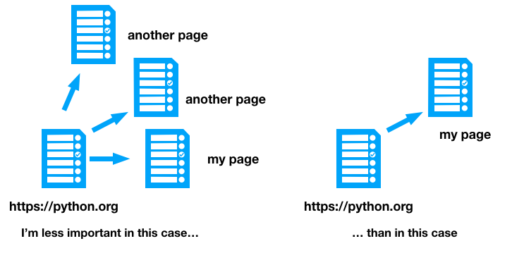 PageRank takes this one step further - backlinks from highly-ranked pages are worth more. Lots of people link to python.org, so if they link to my page, that’s a bigger endorsement than the average webpage.