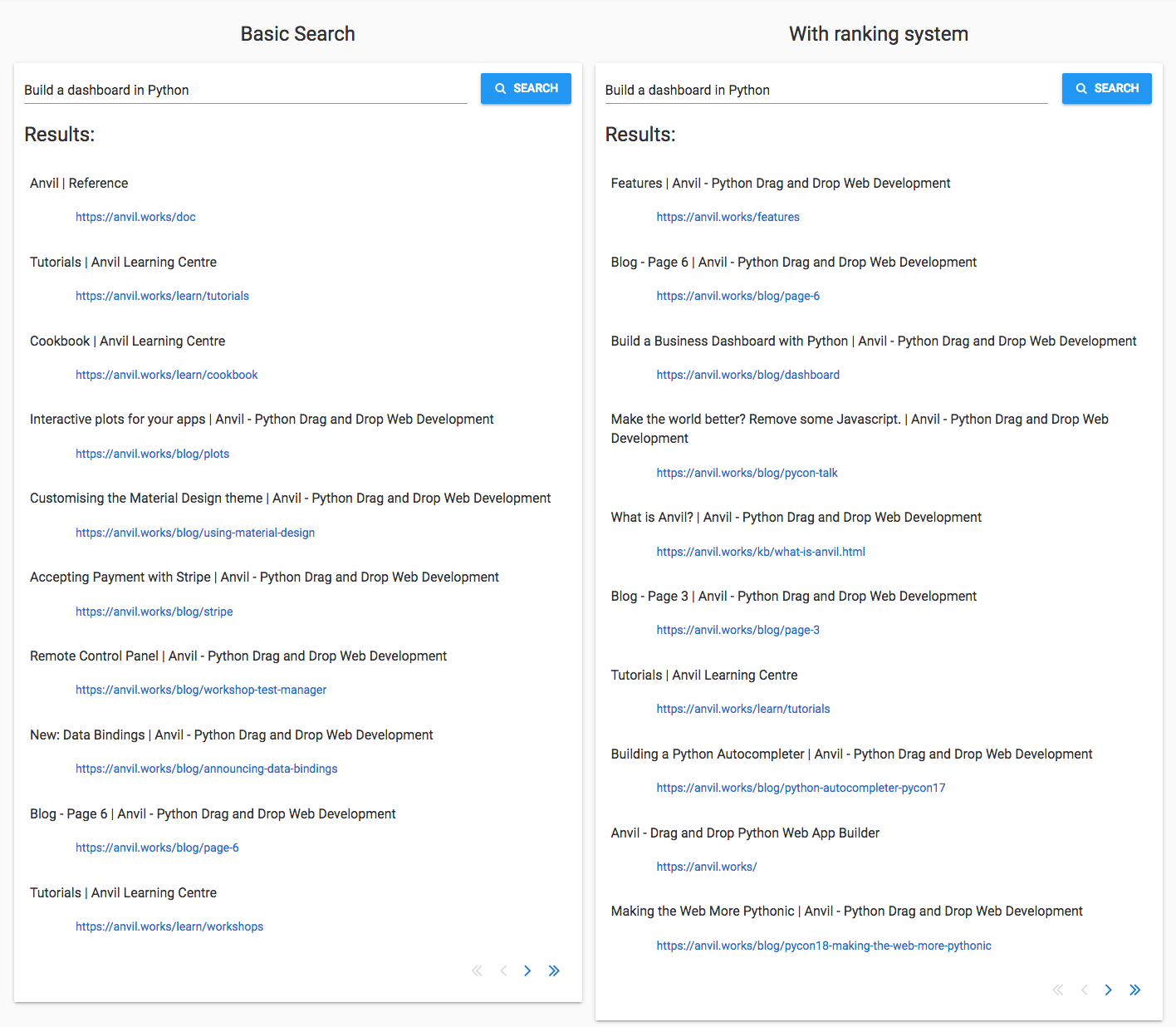 I’m building a search engine using Anvil. So far I’ve built a Python web app that crawls the web downloading pages. I’ve also implemented PageRank so my app surfaces the most important pages.