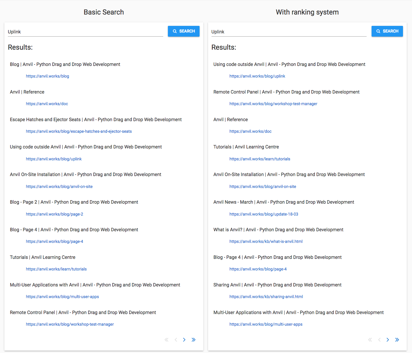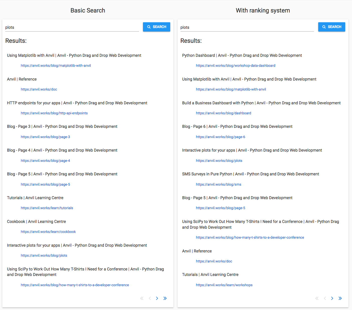 I’m quite pleased with what I’ve achieved. In a few hundred lines of code, I’ve built a search engine that does a really great job of serving single-word queries from the Anvil site. There’s still room for improvement with multi-word queries, but the results are good enough that the user can find the best match somewhere on the first page of results.