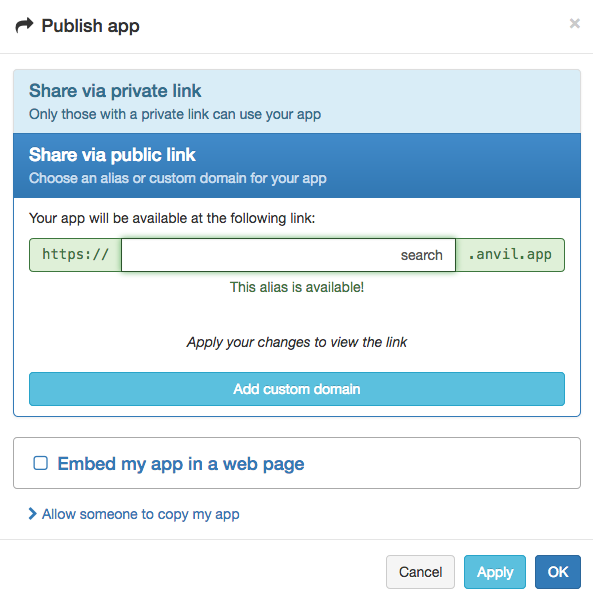 As with any Anvil app, it’s auto-hosted at a private URL. To give it a public URL, I just enter my desired subdomain of