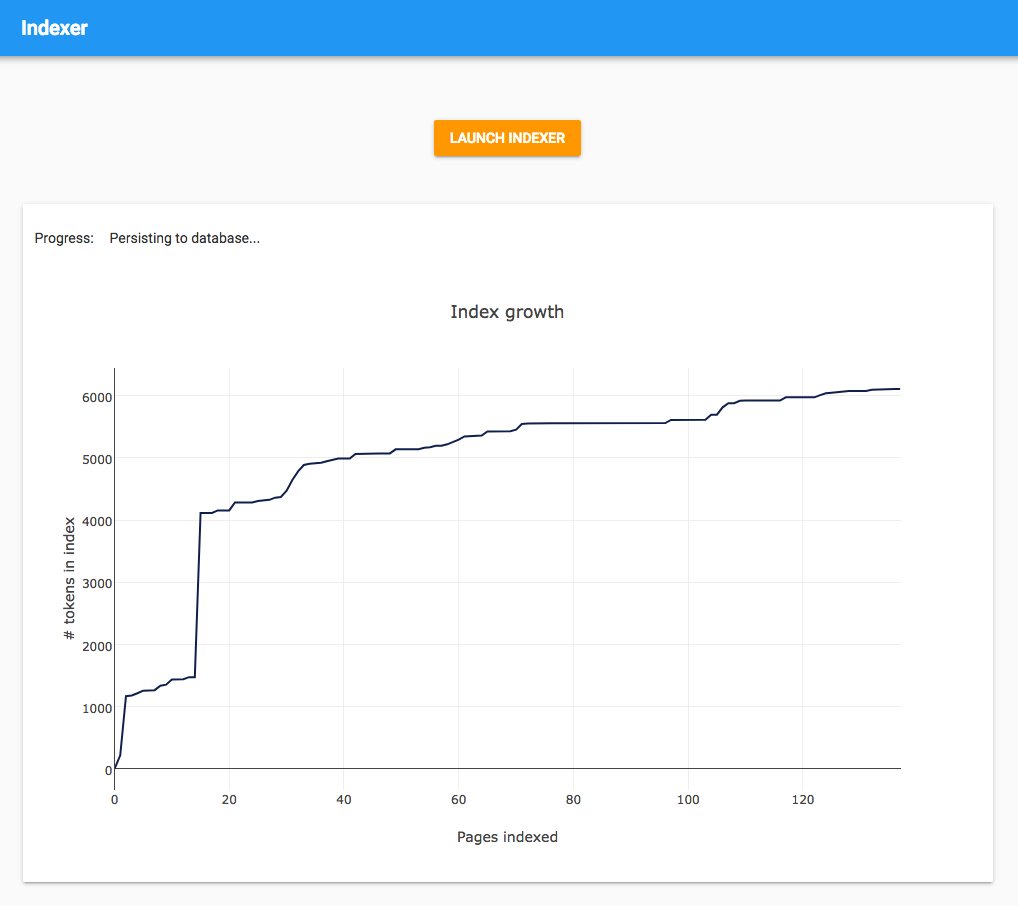 return indexI’ve created a UI to launch the indexing process. There’s a button to trigger the Background Task, and I’m keeping track of its progress by plotting the size of the index vs. the number of pages indexed.