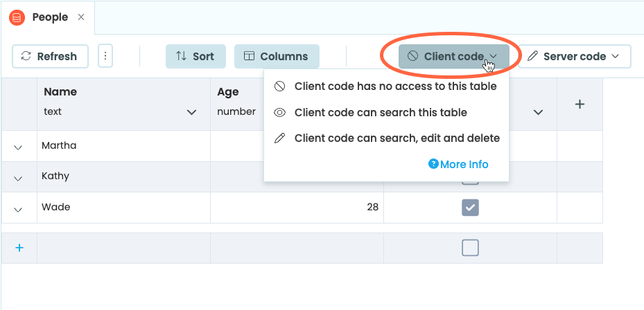 By default, client-side code is not given any access to your Data Tables. You can instead access the data by writing Server Modules that pass the data back to your Forms. You can also expose views to give your client-side Forms permissions on limited sets of data from your Data Tables.