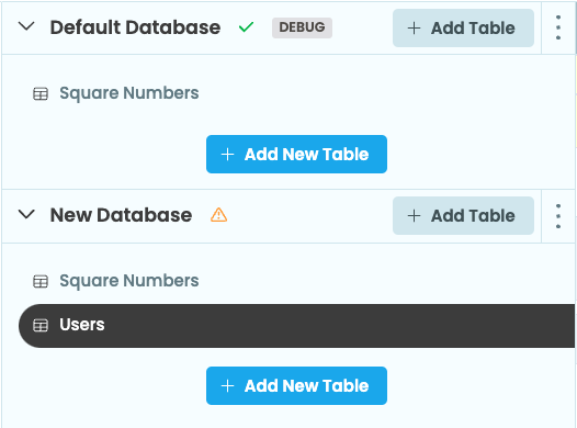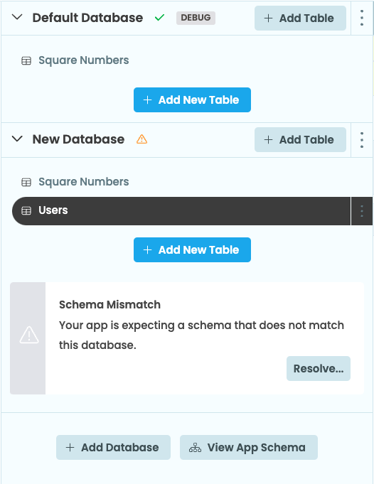 To change which database your app uses when it runs in the Editor, click on the three dots next to the + Add Table button of your desired database.
