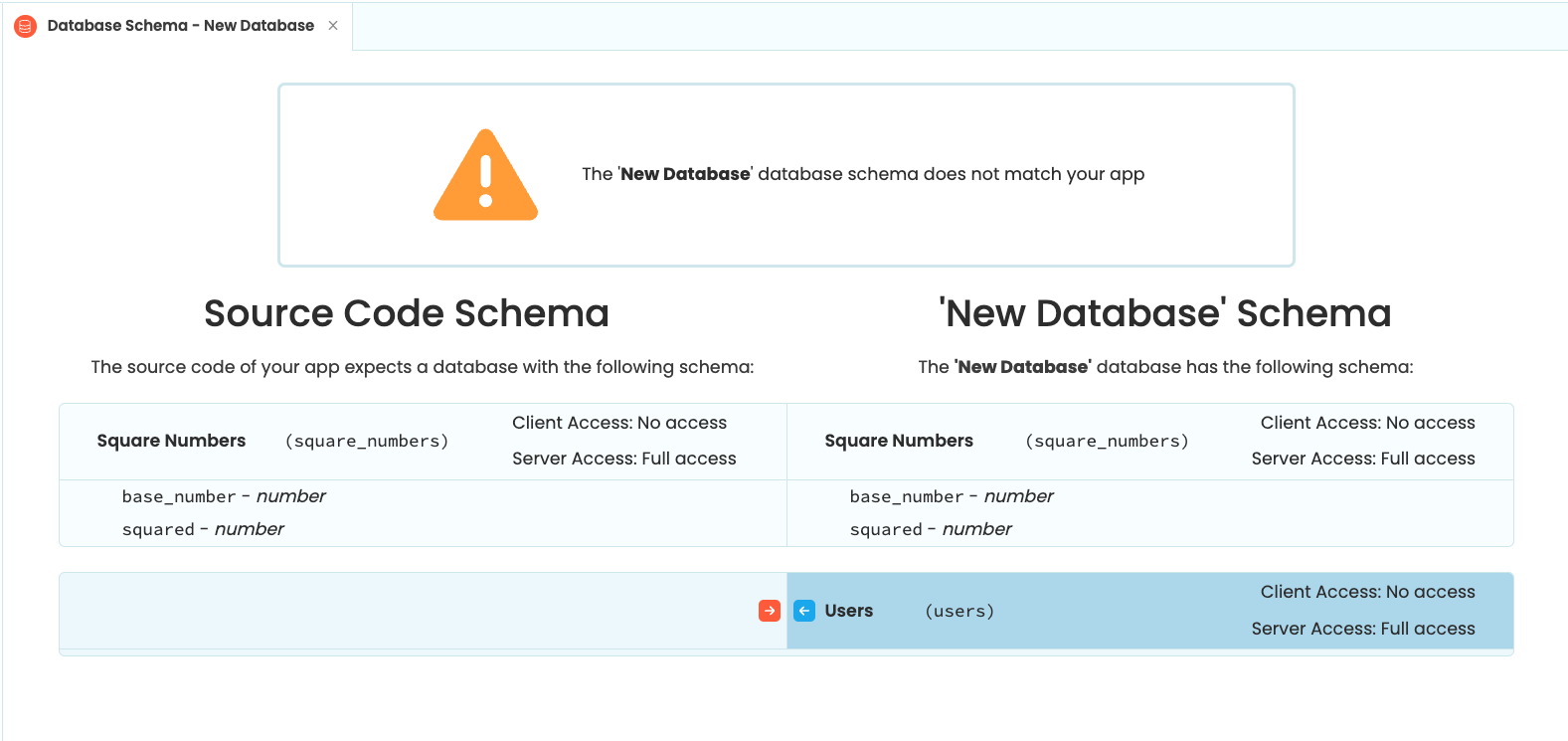 A database schema contains information on the structure of a database i.e. what tables and columns a database should have. Each Anvil app has a database schema and when you load an app in the editor, Anvil checks to make sure the database the app is using matches the app’s database schema.