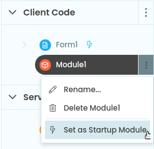 We want this module to run when our app loads, so we’ll set this to be the startup module. Open the dropdown menu next to ‘Module1’ in the App Browser, and select ‘Set as startup module’.
