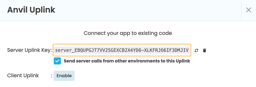 Click on the enviroment you want to connect the uplink to to selct it, and click Enable next to Server Uplink Key