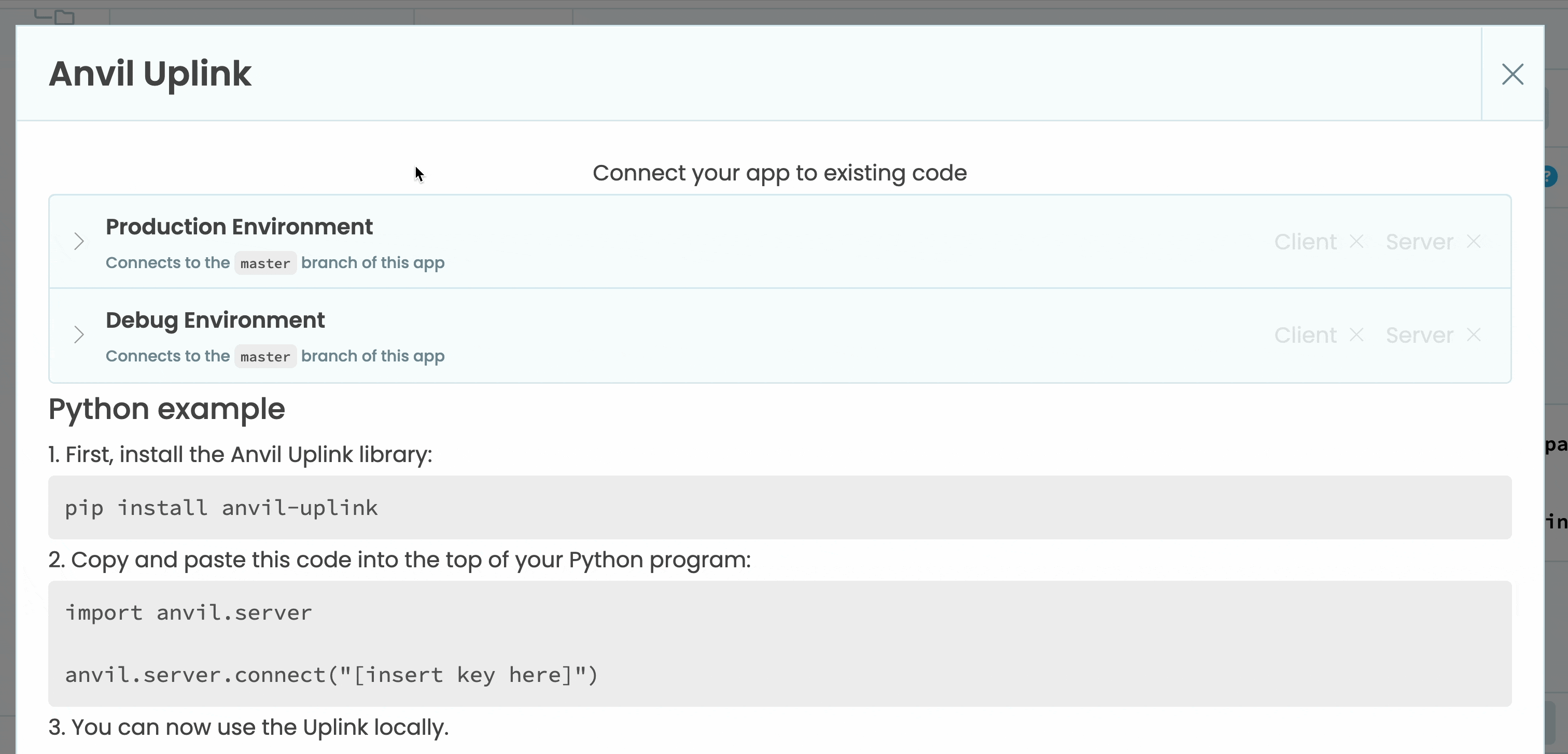 anvil.server.wait_forever()Replace the "<your Uplink key>" string with the Uplink key from your app.