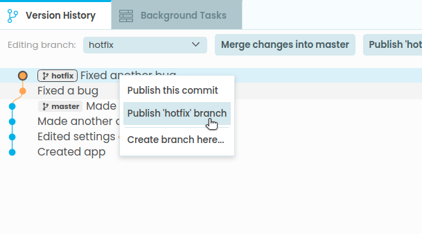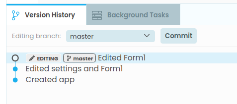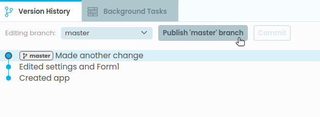 You can also create branches in your app. These are labels that point to a particular commit. Your app starts with a single branch, called master. You can choose which branch you’re editing from the Editing branch dropdown. When you’re editing a branch, that means this branch will move as you edit your app, to point at each new commit as you create it.