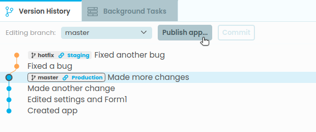 To publish a specific commit, you can right-click on that commit and choose Publish this commit. This will ensure that whenever someone visits your app’s URL, they load the app from this commit: