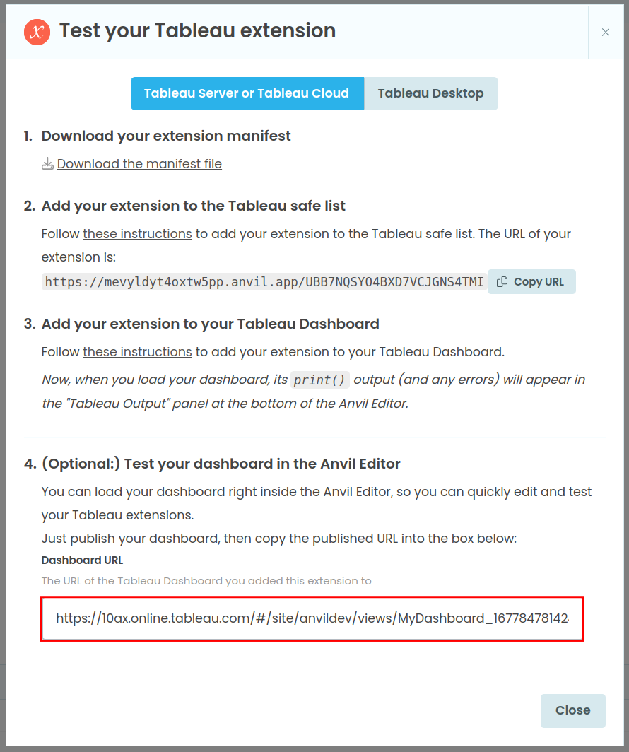 If you are using Tableau Cloud or Tableau Server, you can test your dashboard inside the Anvil Editor, which lets you edit and test much more quickly.
