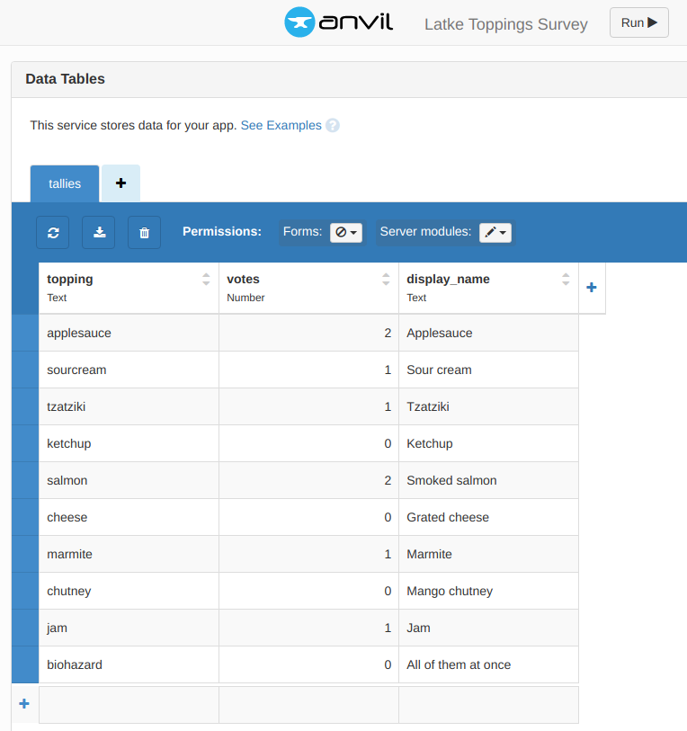 anvil.server.cookies.local['voted'] = TrueThe bits using anvil.server.cookies are there to ensure that a single user can’t just vote for a given topping over and over again. Anvil’s cookie handling allows you to store data for a given user for 30 days, so unless you care enough to continuously open incognito windows or clear your cookies, it means that your vote only counts once.