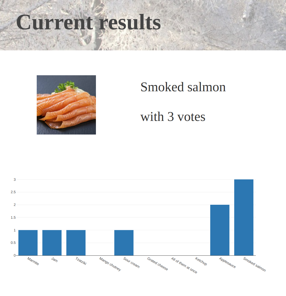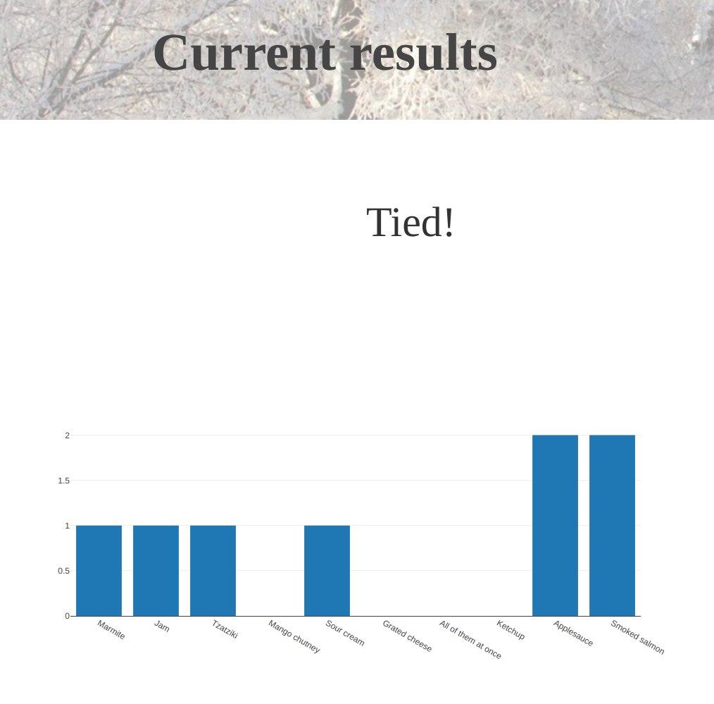 open_form('ResultsForm')Refreshing the page will take you back to the survey form, but clicking another topping won’t count towards the vote standings, because you’ve got voted = True in your cookies (unless you cheated, and opened an incognnito window…)