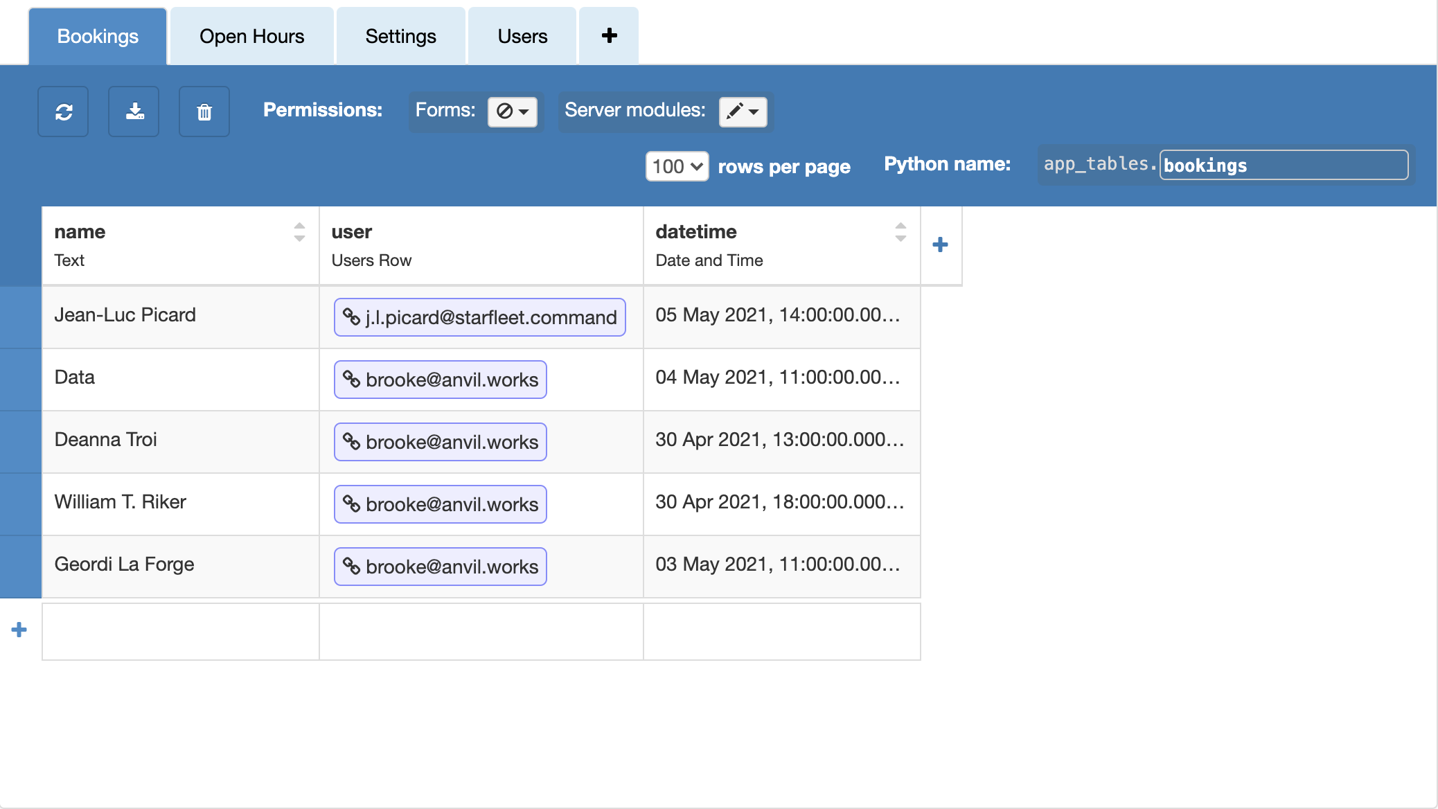A separate form displays all current and past bookings made by the currently logged in user. If the user is an admin, they can see all bookings made by anyone. Here, users can cancel any upcoming booking and admins can easily email customers regarding their booking. The app automatically emails the user when a new booking is made or when a booking is cancelled.