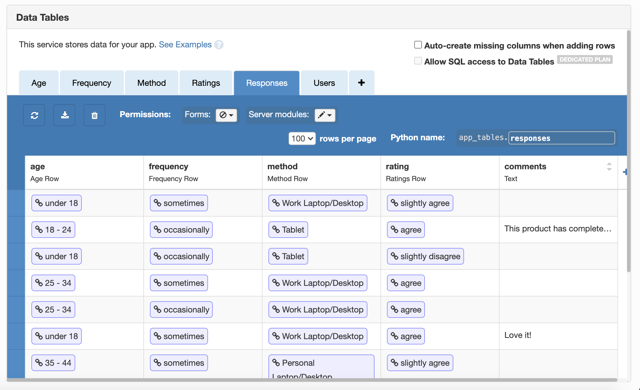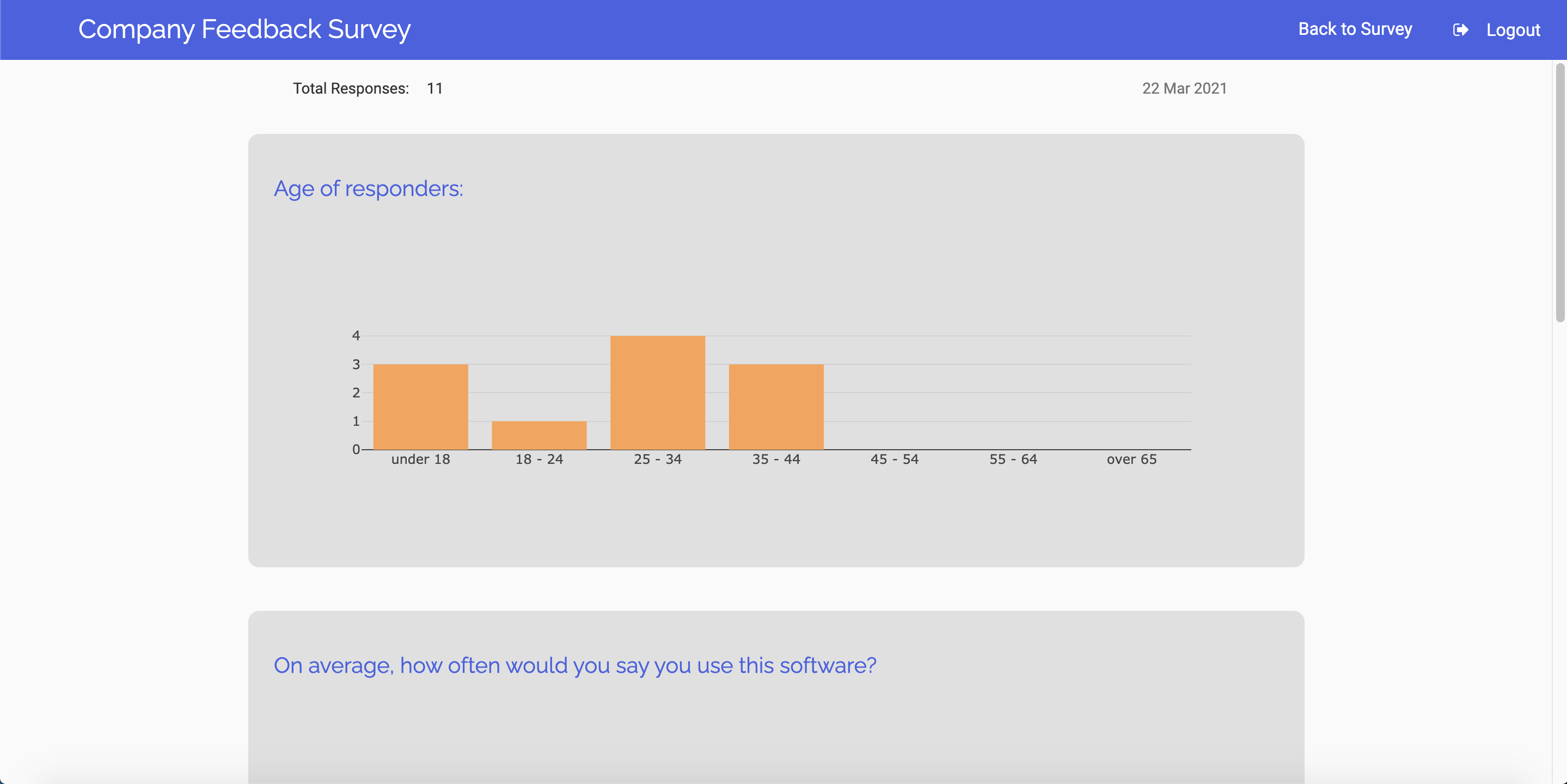 When the submit button is clicked, the responses are stored in Data Tables. Each questions (except for the open-ended one) has a corresponding Data Table which stores the options for that question and the number of responses. A master DataTable stores responses from each user by linking to these other Data Tables.