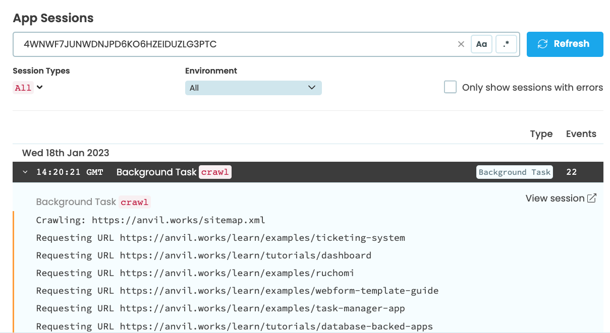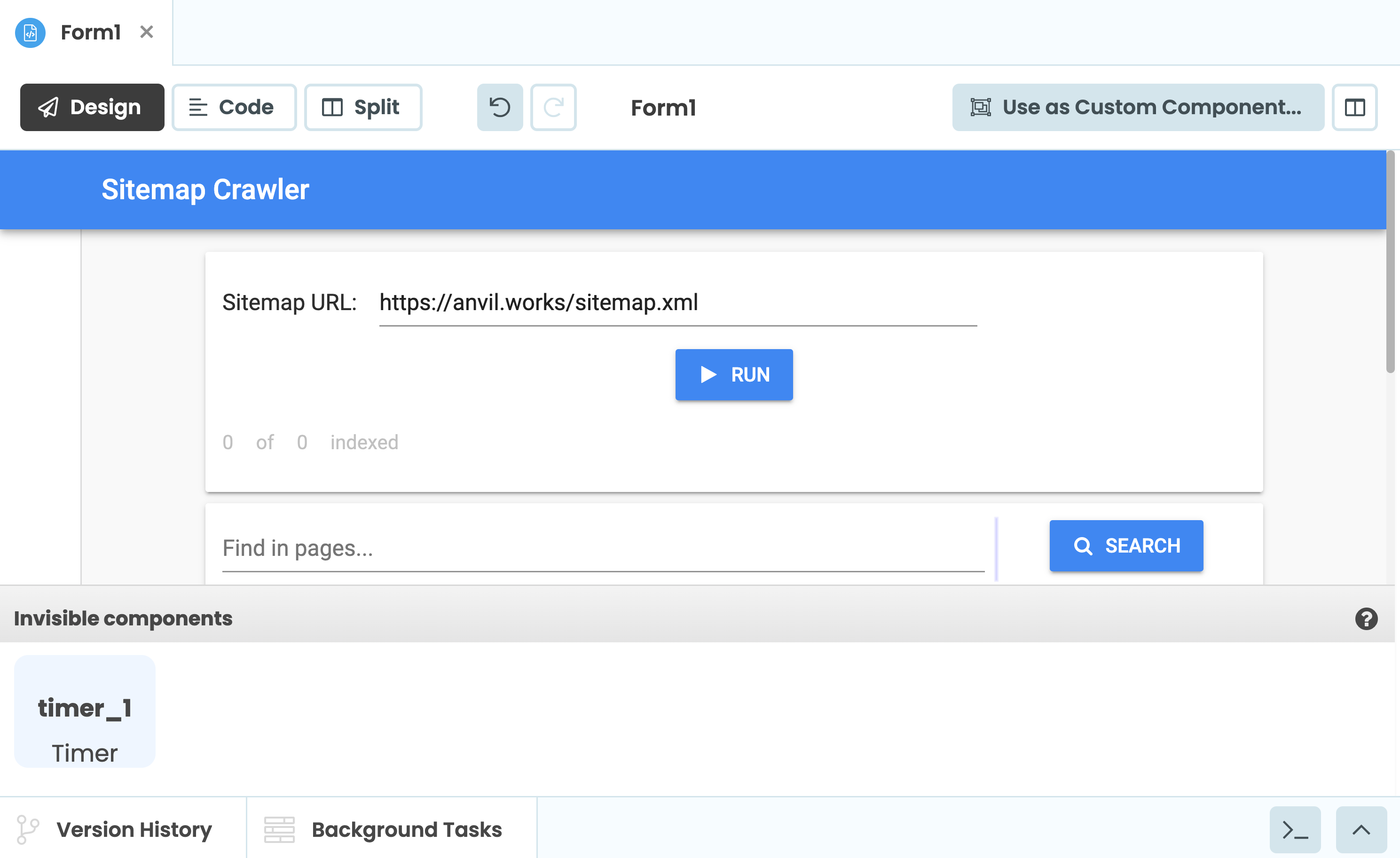 print('Crawling: ' + sitemap_url)Decorating it with @anvil.server.background_task tells Anvil this can be run in the background.