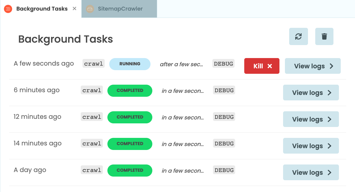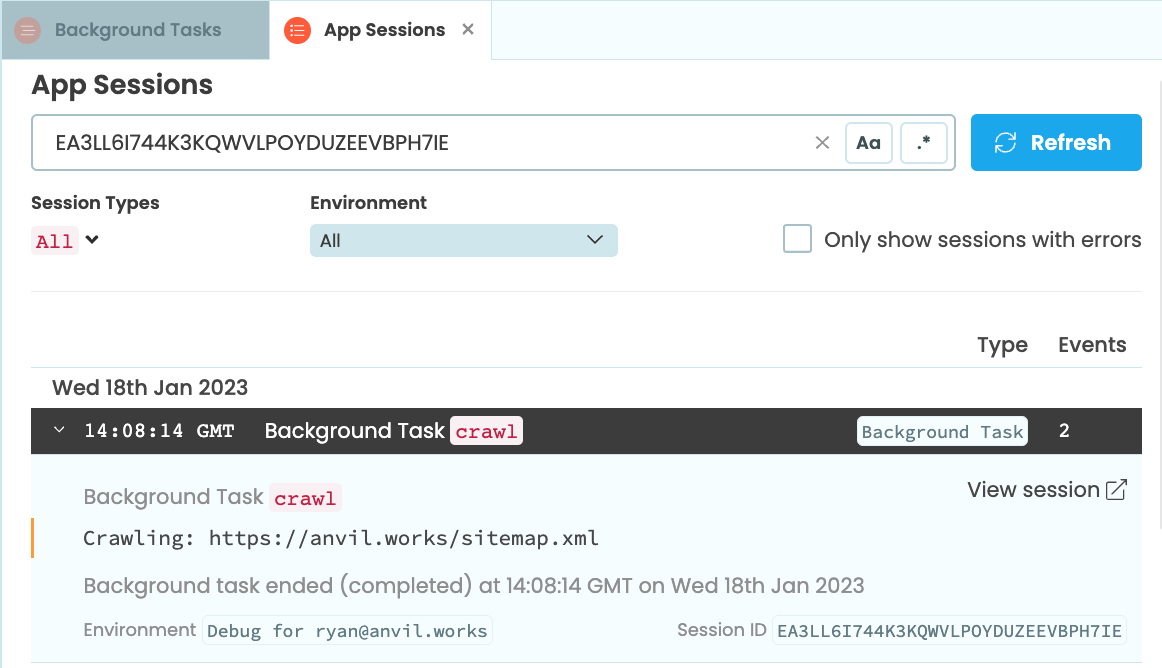 In our app, we see that our task printed Crawling: https://anvil.works/sitemap.xml before finishing. If the task had raised an exception, that would appear here too.