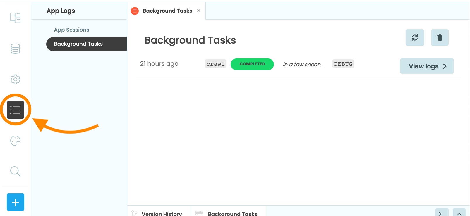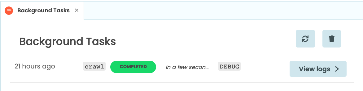 The ‘View logs’ button next to each task takes you to the App Logs entry for this task. There is one entry for each Background Task - all the logs from a particular task are grouped together.