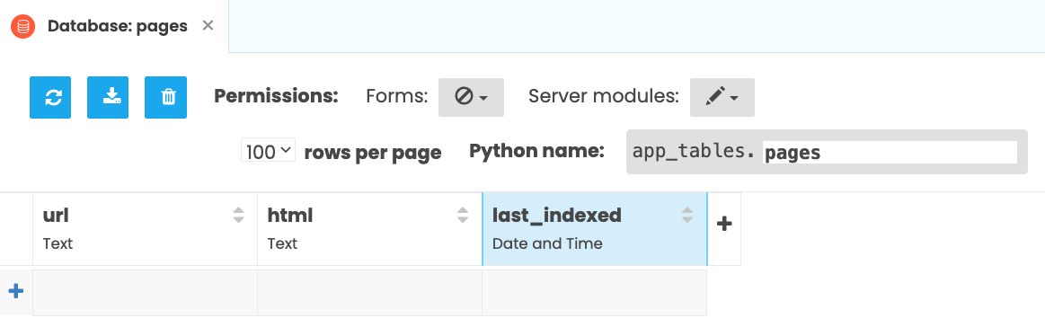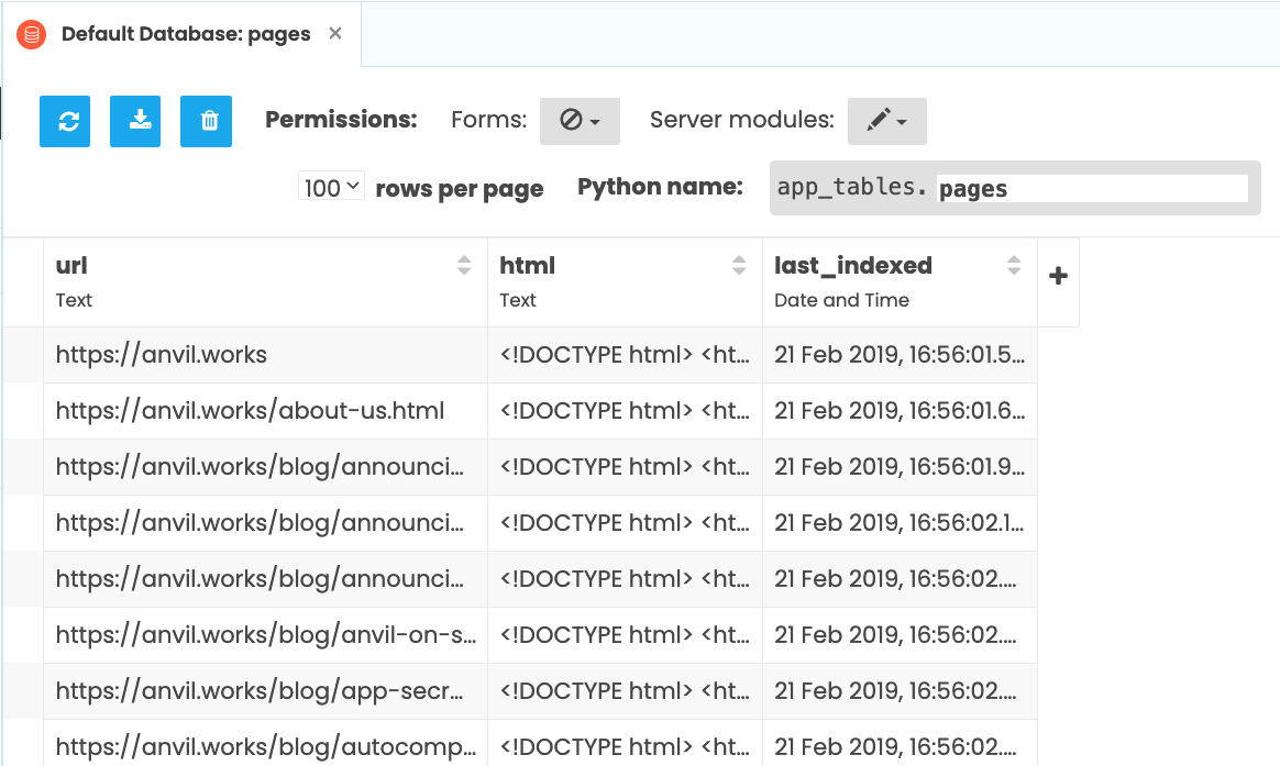 So write a simple server function to get the data from the Data Table. For speed, we use Anvil’s full-text search capability, then return only the page URLs to the client: