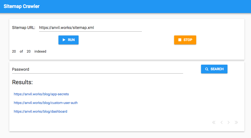 anvil.server.call('kill_crawler', self.task)Now we can hit this button to stop the crawling process. That should prove useful if a site turns out to be much bigger than we thought!