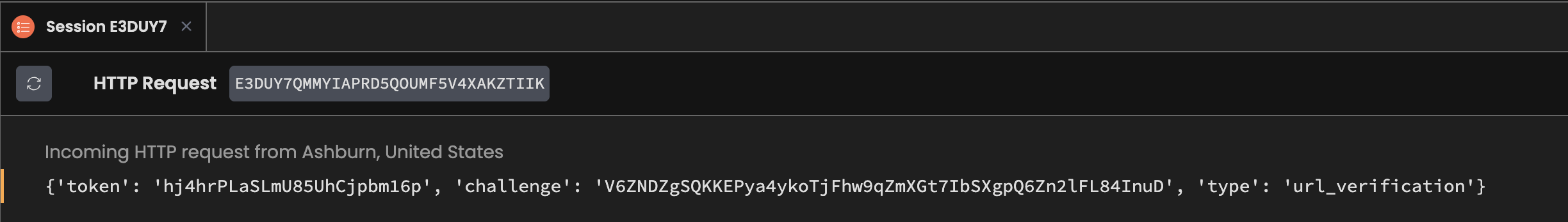 Now we need to go back to the Slack API, and tell it where to send message requests. In the Slack API, click on “Event Subscriptions” in the side bar and toggle “Enable Events” to be on. In “Request URL”, paste your app URL here and add /_/api/incoming_msg (or whatever path you supplied to the HTTP endpoint) to the URL. As it says on that page, Slack is now going to send a request to our URL with a challenge parameter and we need to respond with the challenge value. The request should look like what Slack shows here.