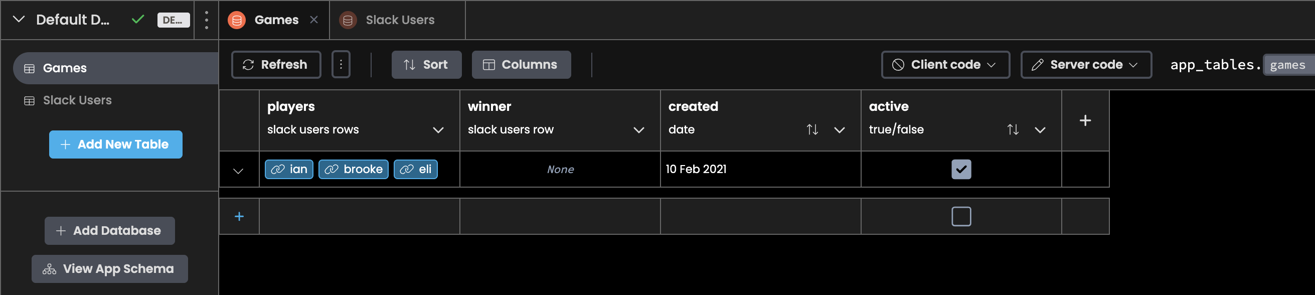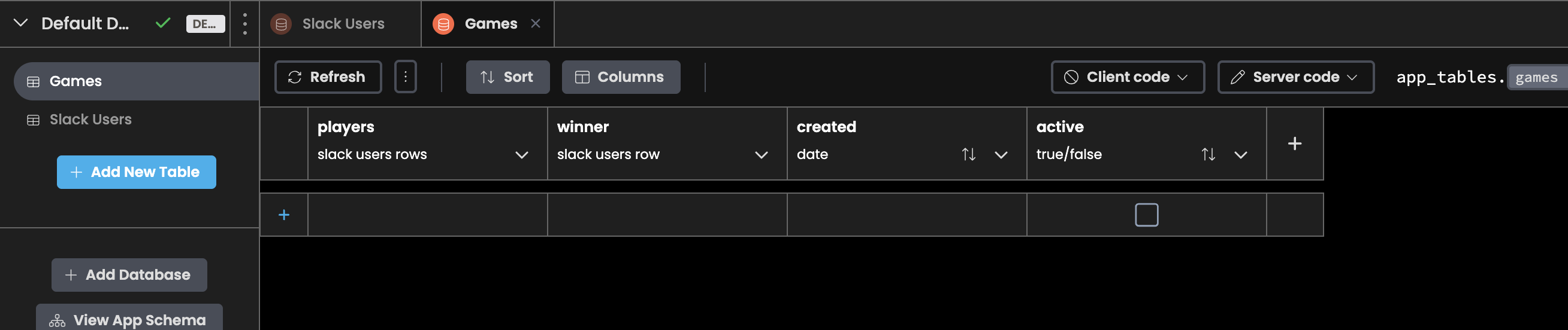 Now that we have a games Data Table, let’s edit our slack_users table to include a column that links back to the games Data Table. That way we can indicate which game each player is currently a part of.